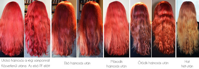 Az látható, hogy az első használat után tényleg szép, azonnal fényes, puha, minden ami kell, de feltűnt, hogy sokkal fakóbb a pirosom. Az ötödik hajmosás azért kakukktojás, mert itt este fotóztam le a hajam, pedig munka előtt, reggel mostam meg [a vakus képeken mindig nagyon vörös a hajam, akár milyen rezes igazából]. A hajam négy hétig simán megtartja a pirosságát, ezután kezd egyenletesen fakulni, habár a hajtöveknél pirosabb marad. Ezekkel a termékekkel pikk-pakk 2-2,5 hét alatt teljesen kifakult, majdnem sírtam is emiatt. A hajvégeimet is fotózgattam egy ideig, de nem látható a töredezés így, másrészt ugyanazt a részt sosem tudnám lefényképezni.